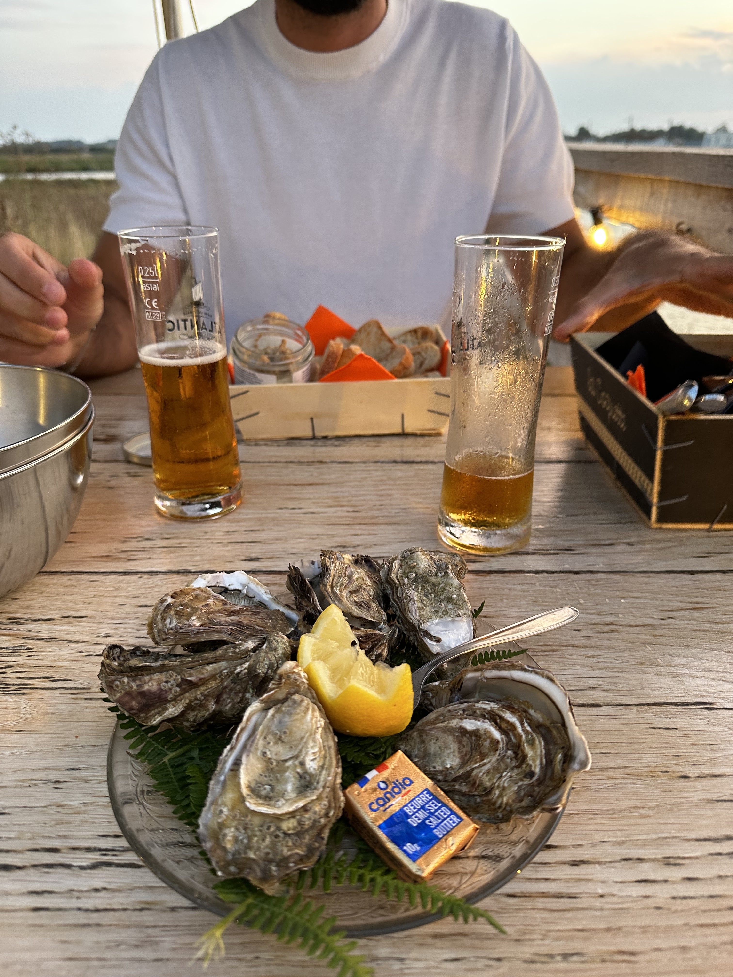 Super dégustation, on a partagé 12 huîtres avec du grillon et une platée de moules extra avec un chablis... Avec le soleil couchant et une petite bise..