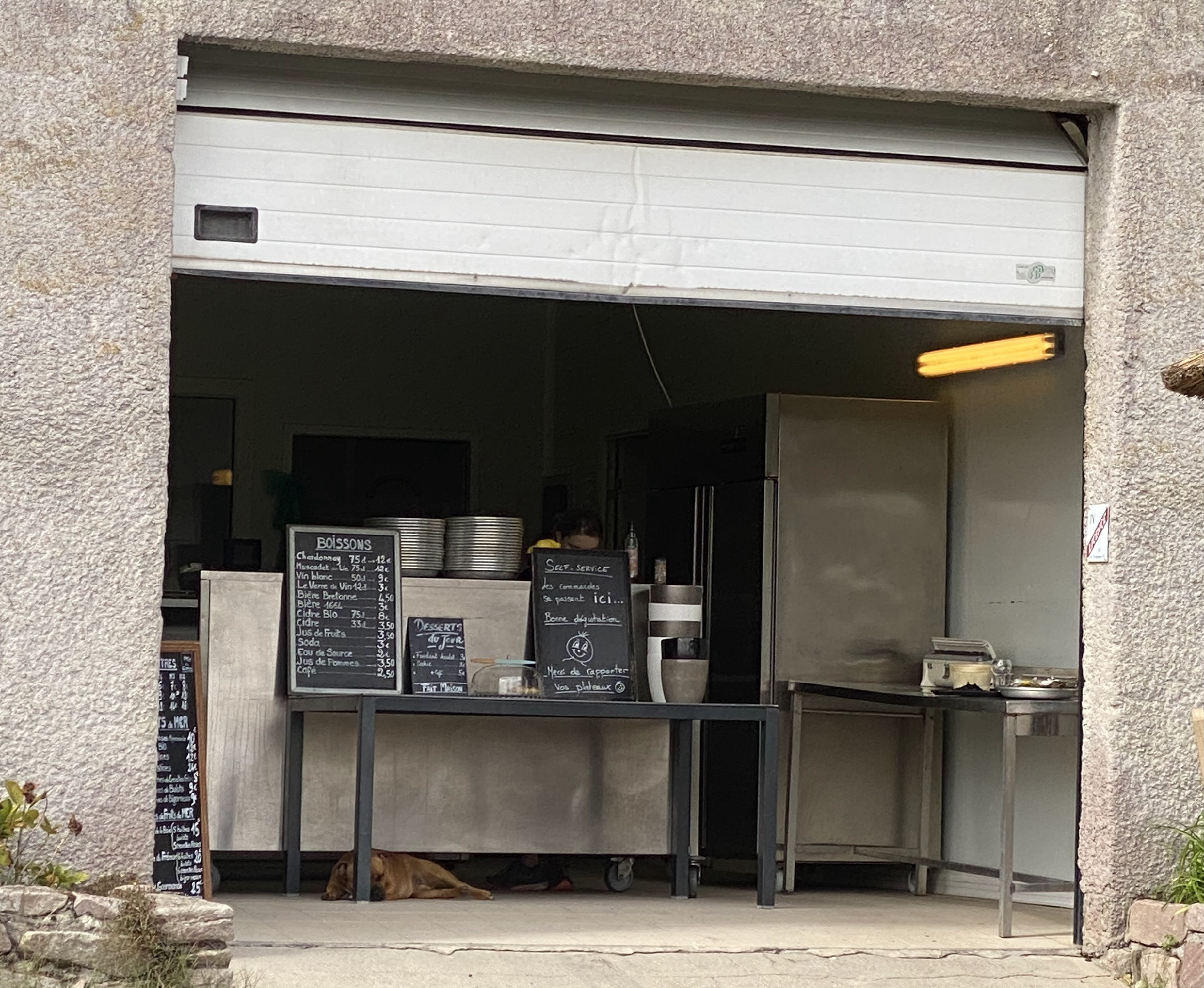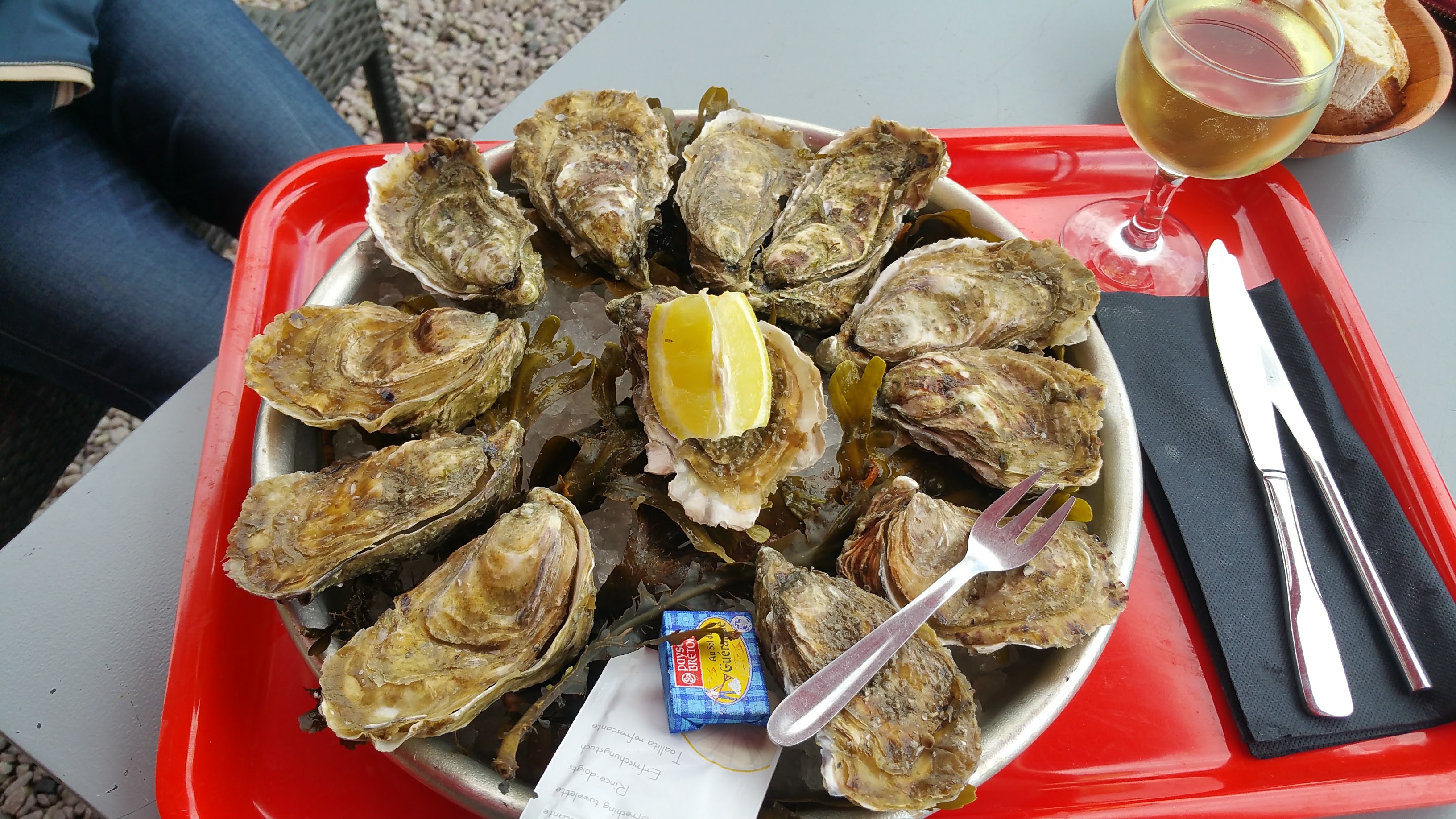 Après une randonnée de 10 kilomètres jusqu'au Moulin de la Mer, en marchant vers la mer à marée basse et retour, nous avons trouvé ce petit restaurant simple. Une bouteille de vin blanc et 12 huîtres, avec du très bon pain... heureusement qu'on a trouvé ça ?